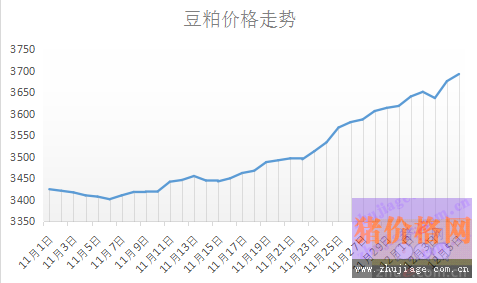 今日豆粕均价是3692.08元/吨,目前豆粕依旧是处于一个上涨的局势。如表4,自11月7日始豆粕便开始上涨,在此期间虽然有下调,但很快的便又回到了上涨的局面。我们可以很容的就看到,从11月23日开始豆粕价格上涨的速度便开始加快,与11月初价格3441.70元/吨相比,到目前为止豆粕已经上涨了250元/吨。(这里的数据是养殖户饲料厂到手价格)