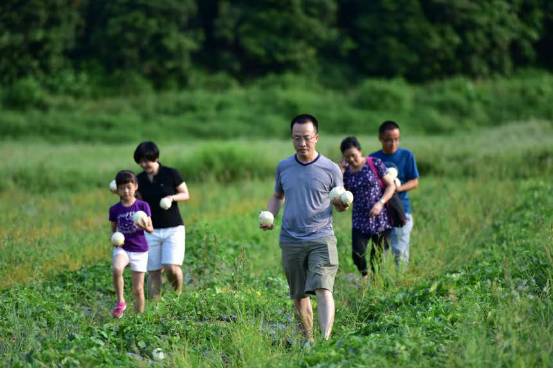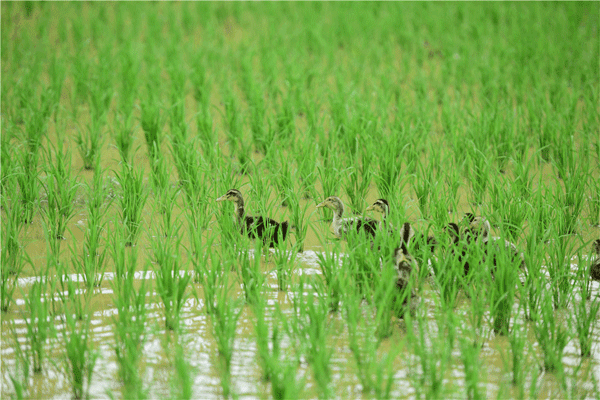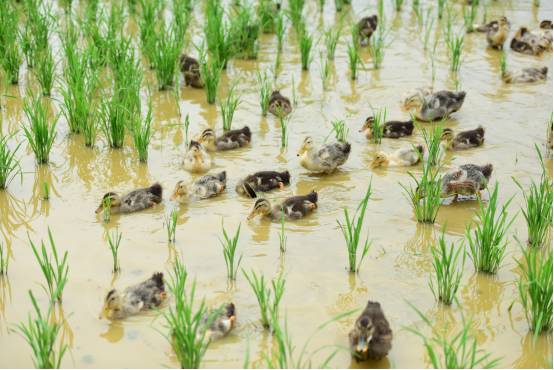 艾米农场在田中野放两千只鸭子,利用稻鸭除草除虫,用鸭粪施肥