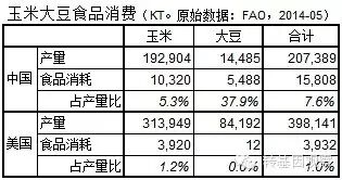 事实3:在美国,转基因玉米和大豆种植面积属最广之列。就拿这两个作物比较看,美国的玉米和大豆的食品消耗量远远不如中国,如下为联合国粮农组织2014年颁布的2011年食品消费统计: