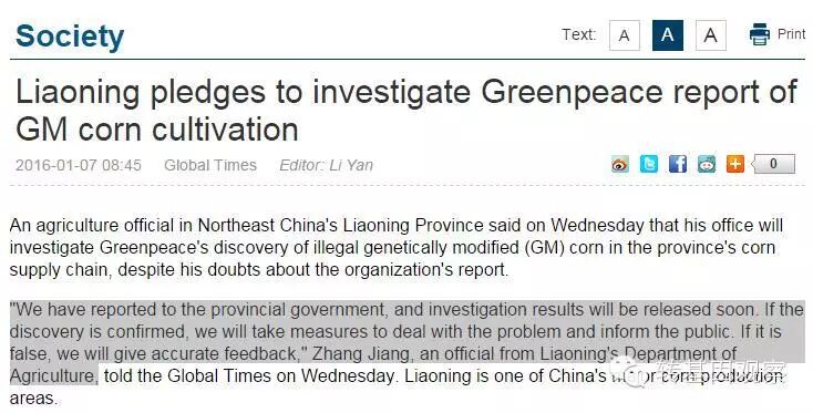 次日,辽宁省农业厅在《环球时报》英文版的采访中表示,他们“已将此情况汇报给了省政府,并将立即展开调查。如果发现属实,他们将立刻采取措施并公之于众。如果发现有误,也将给予准确的回应。”