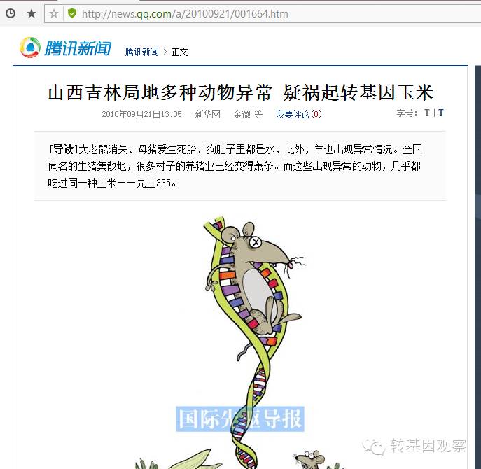 这则传言最早见于新华社媒体报道,2010年9月21日,新华社《国际先驱导报》发表了记者金微的调查文章《老鼠不见了——山西、吉林动物异常现象调查》称,山西、吉林等地出现老鼠变少甚至绝迹、母猪流产死胎等各种异常现象,这种重大生态异常现象和国外转基因试验结果高度吻合,疑与当地大量种植先玉335玉米有关,而美国专利局网站数据显示先玉335的父本PH4CV是转基因品种。