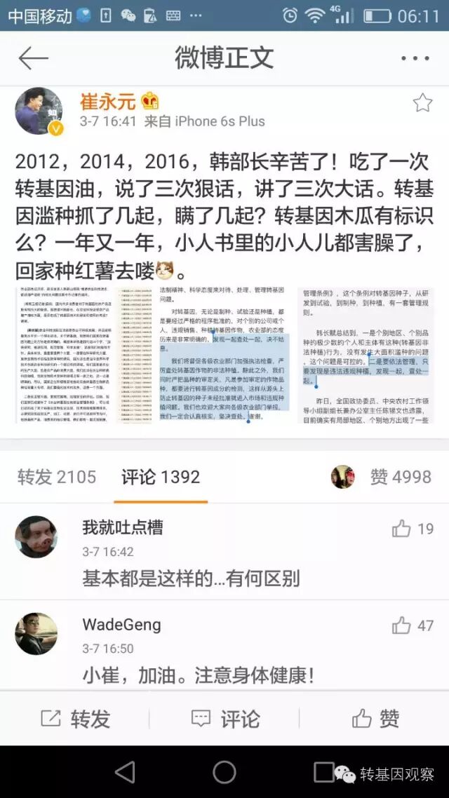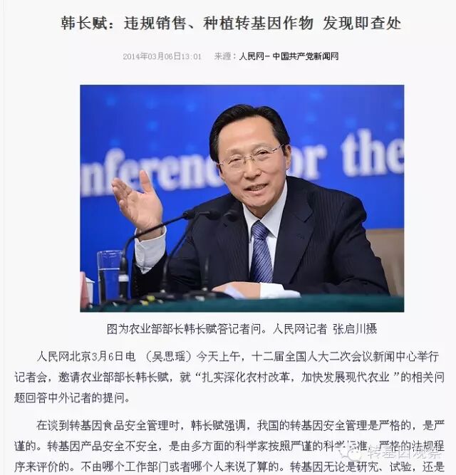 3月7日,农业部长韩长赋在两会新闻发布会上作出关于转基因非法种植的表态后。著名主持人崔永元发微博说:2012,2014,2016,韩部长辛苦了!吃了一次转基因油,说了三次狠话,讲了三次大话。转基因滥种抓了几起,瞒了几起?转基因木瓜有标识么?一年又一年,小人书里的小人儿都害臊了,回家种红薯去喽。