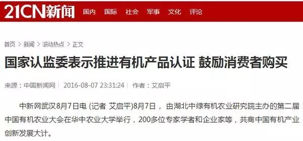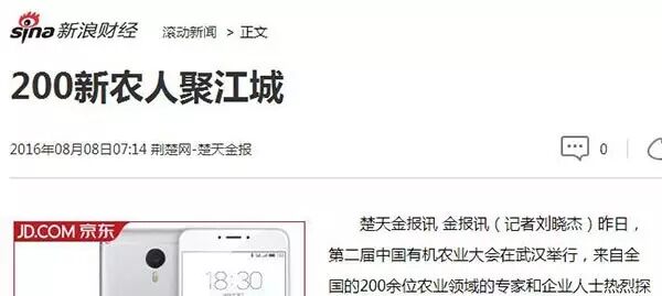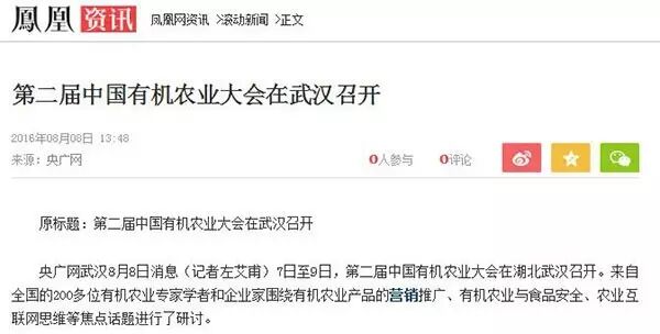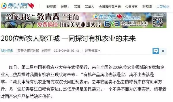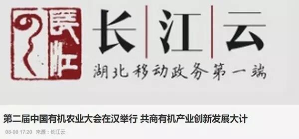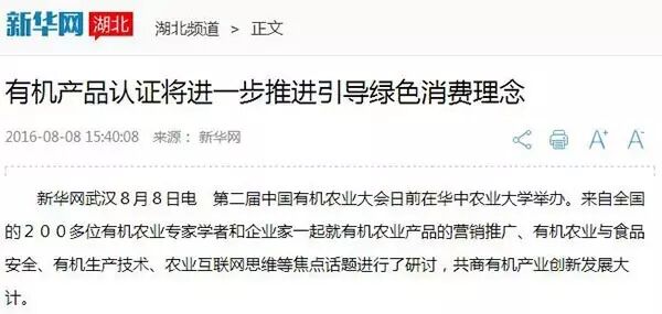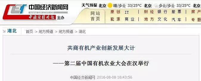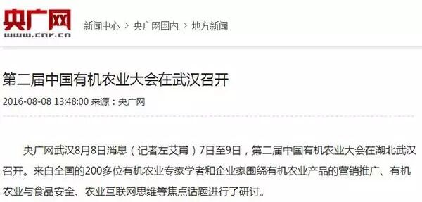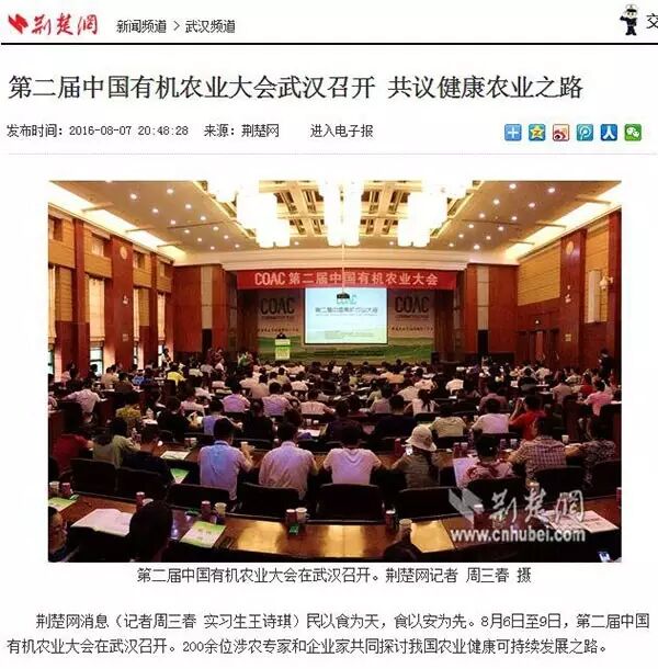 原来是第二届中国有机农业大会在武汉华中农业大学国际学术交流中心隆重召开,吸引了中国新闻网、中国青年报、央广网、新华网、湖北省人民政府网、楚天金报、荆楚网等多家媒体对第二届中国有机农业大会进行了全方位、多角度的深入报道,更是引发了数百家网站的转发。 8月7日晚中国新闻网、中国青年报陆续发布大会新闻,随后荆楚网连续发布两篇新闻报道,从不同角度对第二届中国有机农业大会进行了报道。新华网、央广网、湖北省人民政府网、农村新报、楚天金报也相继报道了大会盛况。 新华网报道: