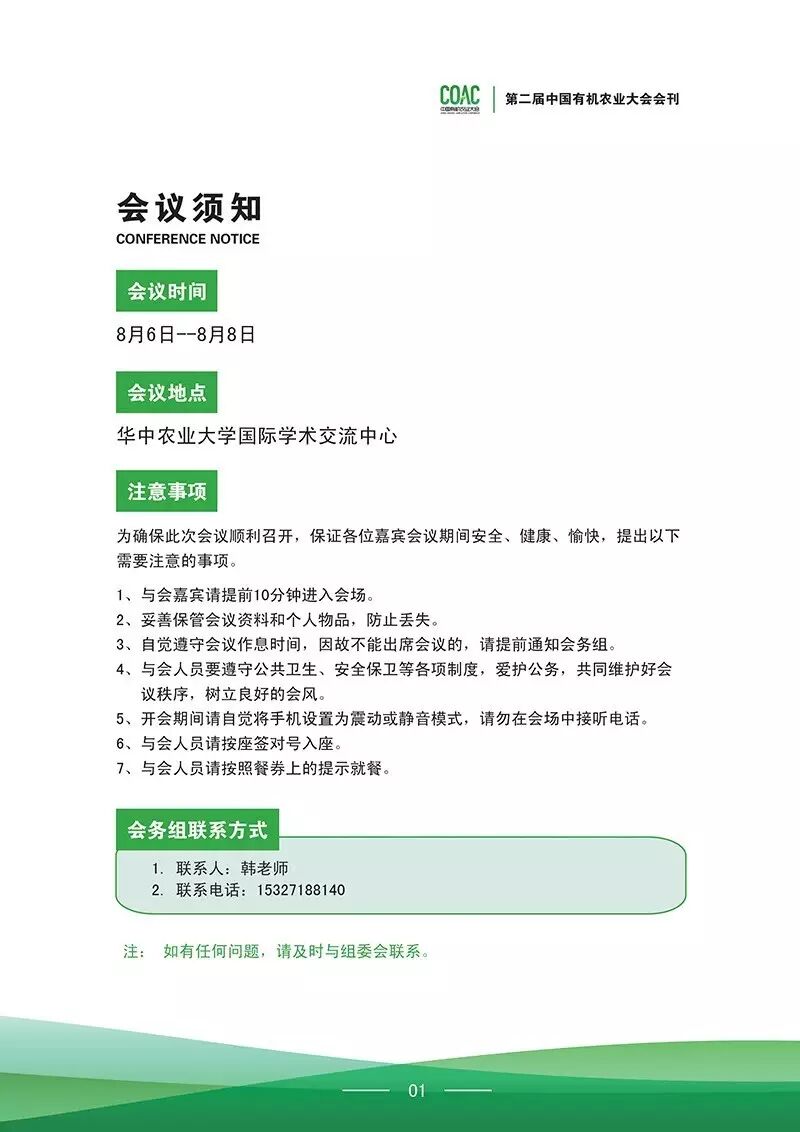 第二届中国有机农业大会8月6-8日在华中农业大学国际学术交流中心召开,《大会会刊》今日正式定稿付印,会刊采用200克铜版纸全彩色印刷,总共32页,以下仅摘取了部分页面,届时一定让参会嘉宾耳目一新。