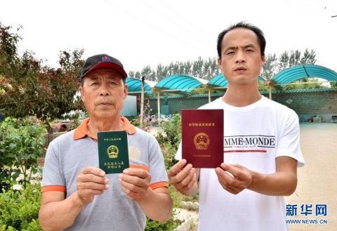 6月22日,刘玉东(左)、刘奎甲展示《农民技术人员职称证书》和《新型职业农民证书》。 新华社记者 朱旭东摄