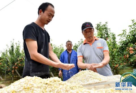 6月22日,刘玉东(右)、刘奎甲在梨园里查看肥料配比情况。 新华社记者 朱旭东摄