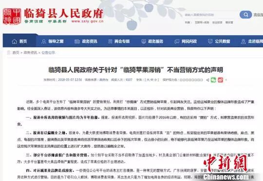 声明中称,多个电商发布“临猗苹果滞销”的营销策划,利用打“悲情牌”营销临猗苹果,给当地果业品牌形象造成了严重影响,并且营销内容有诸多夸大失实之处。