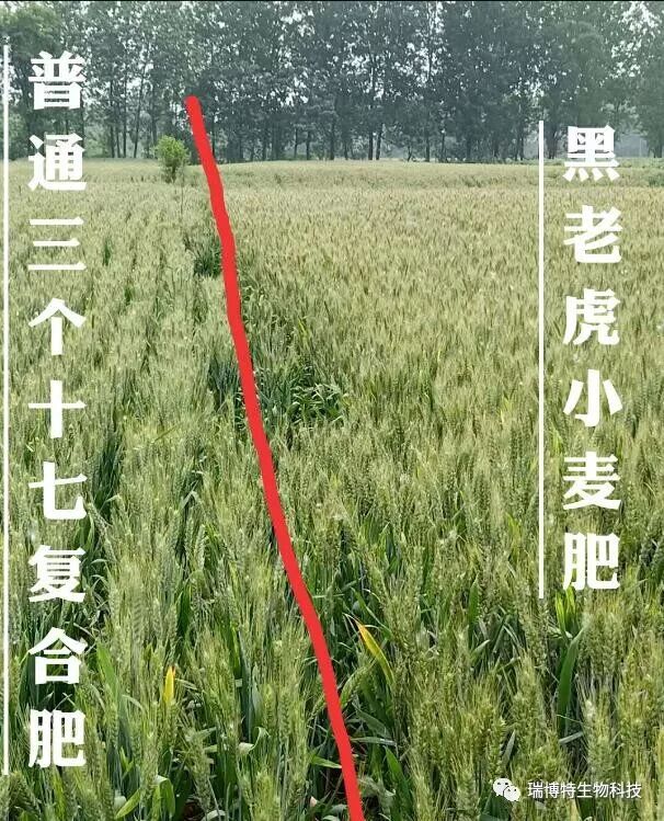 亩施黑老虎小麦肥100斤加25斤尿素一次性打底肥超过普通3X18的复合肥100加25斤尿素的效果。其根系发达而白,有效穗明显更多,倒三叶叶片更青绿更宽。麦穗下部茎杆明显更粗壮更硬。