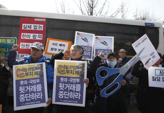 资料图:在韩国首尔的韩国国防部门前,韩国民众高举反对"萨德"系统的标语。新华社记者姚琪琳摄