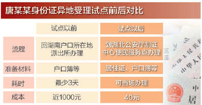 “目前,在武汉市、襄阳市、黄冈和黄石城区已经实现了身份证异地受理。截至11月20日,全省受理制作异地身份证13万余人次。”湖北省户政基础支队工作人员介绍,2016年上半年,湖北省将在全省各地设立异地办证受理点,并全面实现市、州内异地办证。届时,户籍地在湖南省、现居住地在湖北省的居民需要换领、补领身份证,可在省内就近异地办理。